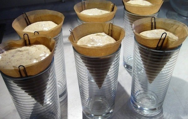 Молотый миндаль смешать с мукой и крахмалом. Аккуратно вмешать мучную смесь в яичную массу.Тестом наполнить кондитерский мешок и из него наполнить бумажные кульки.