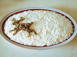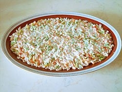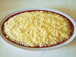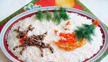 Отвариваем яйца, разделяем белок от желтка и трем на мелкой терке. Нарезаем мелко капченую куриную грудку, болгарский перец и грибы. Шампиньоны поджариваем на подсолнечном масле. Салат выкладываем слоями и каждый слой перемазываем майонезом. Первый слой салата - куриная грудка, затем болгарский перец, жаренные грибы, желток и белок. Из грибов выклажываем оленя, из курицы - сани, из красного болгарского перца и белка - деда мороза, из укропа - елки.