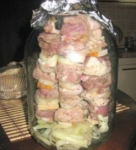 Мясо промыть и порезать на небольшие кусочки. Добавить соль, перец, специи и сок лимона. Лук порезать кольцами и добавить к мясу, добавить воду. Оставить мариноваться на 30 минут. Бекон порезать тонкими полосами. Нанизываем на шашлычные палочки мясо, чередуя с беконом и луком. На дно банки кладем оставшийся лук, в каждую банку кладем 4-5 «шампуров». Закрываем банку фольгой. Важно! Банка должна быть сухая снаружи. Отправляем в холодную духовку (чтоб банка не лопнула), и ставим на 180-200 С на 60-80 минут. Аккуратно открываем духовку, чтоб при разнице температур не лопнула банка. Достаем потрясающе аппетитный шашлык!...СТАВИТЕ ПОДЕЛИТСЯ и рецептик всегда будет на вашей страничке