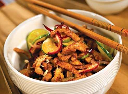 1. Свинину вымыть, обсушить, нарезать тонкими брусками. Фейхоа и лайм вымыть, нарезать кружками. Лук очистить, тонко нарезать.