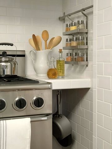 Узкие длинные полки как нельзя лучше подходят для хранения специй. Такими полками можно заполнить пространство на рабочей поверхности под верхними шкафами возле плиты.