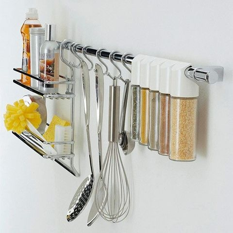 Хромированный рейлинг с контейнерами для специй — еще одна возможность поместить специи на стену рабочей поверхности. Такой рейлиг и смотрится стильно, и очень практичен.