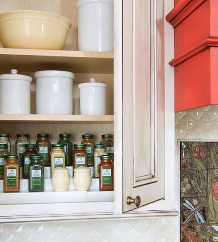 Если у вас маленькая кухня с небольшим количеством шкафов, эта идея хранения позволит компактно разместить специи на трех уровнях — так все специи поместятся на сравнительно небольшой полке в шкафу верхнего уровня, а также вы сразу сможете достать нужную емкость со специями даже с третьего ряда, не задевая два передних.