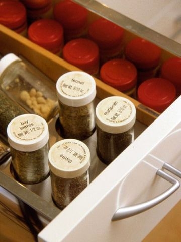Выдвижные ящики идеально подходят для хранения специй. Они позволяют иметь все специи под рукой, когда это необходимо, и скрывают их из виду, когда такой необходимости нет. Этикетку стоит размещать на крышке, если банки стоят вертикально, или на боковой поверхности емкости, если они лежат или под наклоном.