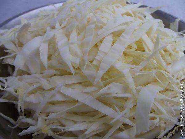 Тем временем режем капусту. Мелко нарезать не нужно, так как тогда капуста не чувствуется в текстуре готового продукта.