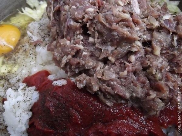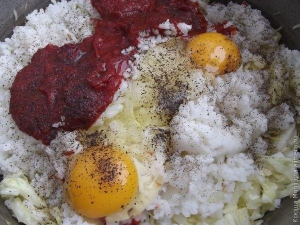 Добавляем яйца, томатную пасту, черный молотый перец и соль по вкусу, если вы ее добавили мало в капусту и отварной рис.