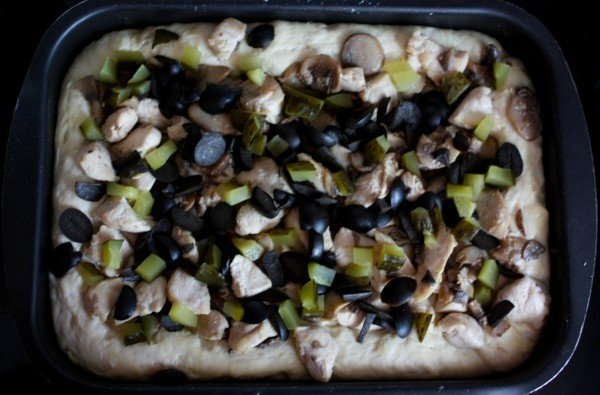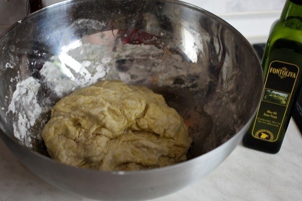 2.Хорошо замешиваем, чтобы образовалось липкое тесто. Смазываем его оливковым маслом и оставляем в миске,накрытой плёнкой,чтобы тесто поднялось.