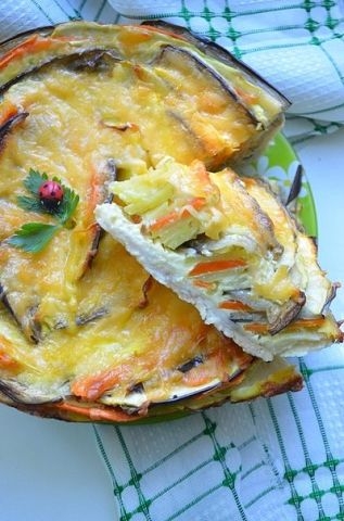 Морковь, цукини почистить и нарезать. Баклажан нарезать прямо с кожурой. В этом пироге важно, чтобы полоски овощей были примерно одной ширины. Подравнять овощи по толщине при помощи ножа, а затем нарезать тоненькими полосками при помощи овощечистки.