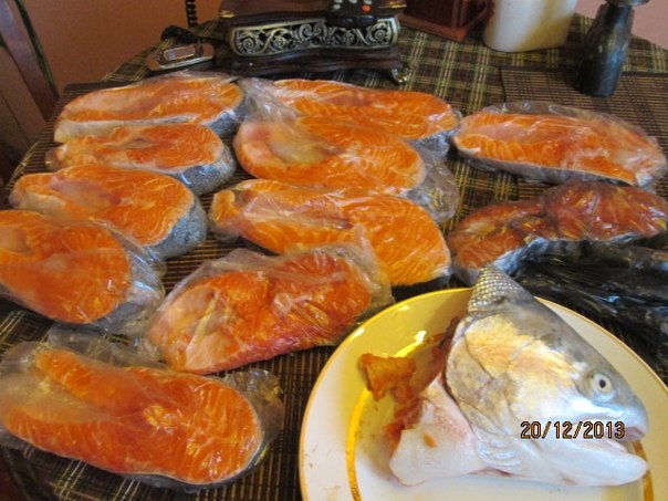Каждый стейк раскладываю по пакетикам и отправляю в морозилку. А голову также мою, чищу, вырезаю жабры. Из неё потом сварю рыбный супчик.