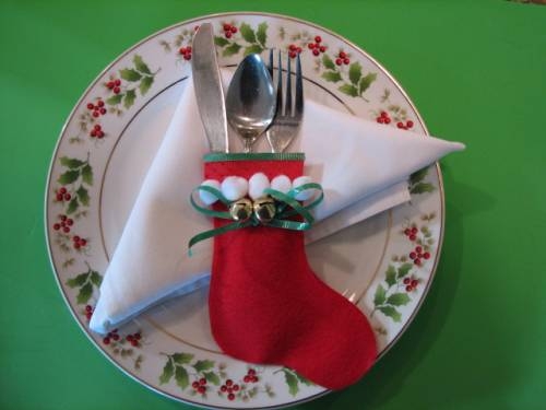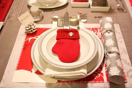 Положите столовые приборы в детские варежки - просто и быстро, зато сразу же настраивает на праздничный лад. Варежку можно украсить красивой брошью или снежинкой.