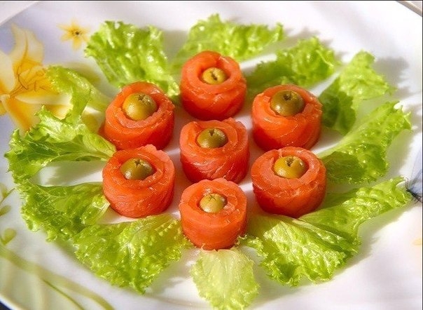 Нарезаем филе рыбы полосками, оборачиваем каждую вокруг оливки, и закуска готова! Выкладываем тарелку салатными листьями и раскладываем на них рулетики!