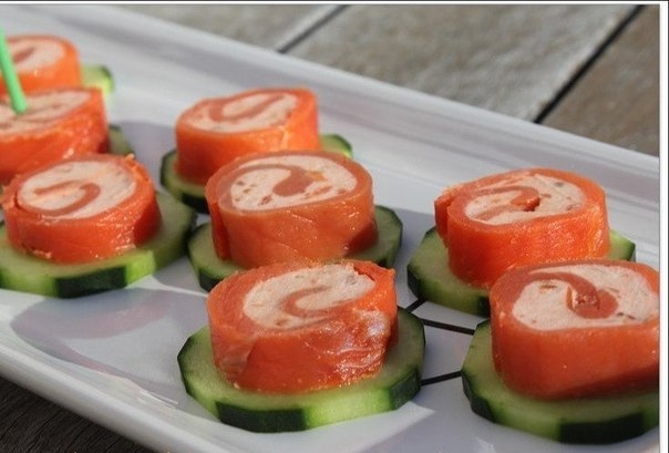 Всё, что нужно для этой закуски - это ломтики красной рыбы и сливочный сыр. Сначала делаем начинку. Для этого мельчайшими кусочками режем рыбу и смешиваем её со сливочным сыром. Потом ровным слоем раскладываем начинку на ломтик рыбы (или сразу на несколько ломтиков, сложенных внахлёст), сворачиваем рулетом и режем на куски толщиной около пол-сантиметра. Подавать такие рулетики хорошо либо на гренке, либо на кружке огурца.