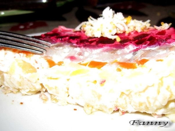 Каждый ингредиент – картофель, морковь, свёклу, сельдь с луком – смешать отдельно с майонезом, оставив немного майонеза для украшения, и выложить слоями в форму.