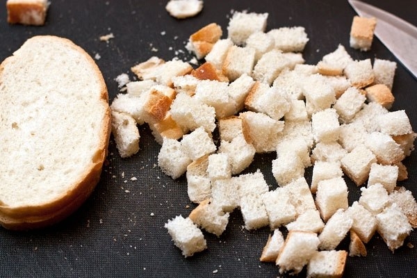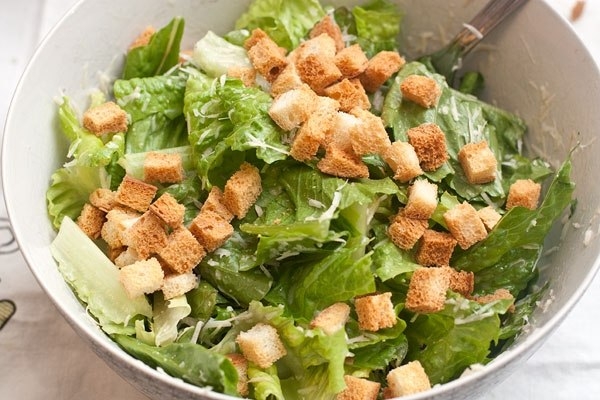 Начните с приготовления крутонов — сухариков из белого хлеба. Нарежьте хлеб небольшими кубиками (не более 1 см) и подсушите в духовке в течение 10 минут при 180 градусах. Посматривайте, возможно потребуется их перемешать ближе к концу приготовления. Листья свежего салата романо хорошо промойте в холодной воде и просушите. Чтобы салат был еще более хрустящим, подержите его в очень холодной воде несколько минут.