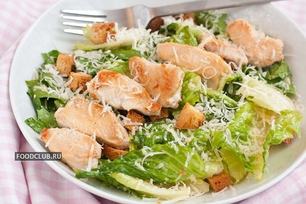 Всыпьте в салат мелко натертый пармезан и еще раз хорошо перемешайте. На широкие тарелки с небольшими бортиками выложите листья салата с заправкой и сыром, сверху посыпьте крутонами (сухариками) и выложите кусочки куриного филе. Можно украсить стружкой пармезана. Подавайте сразу же.