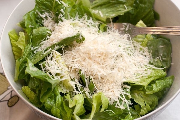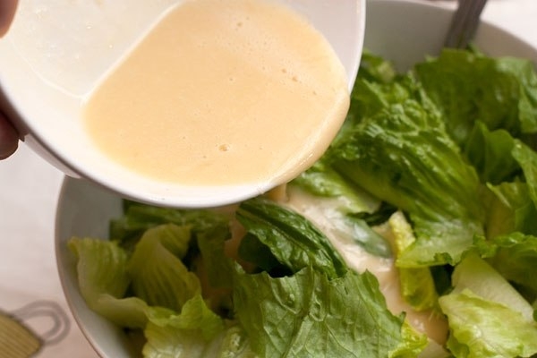 Взбейте соус с помощью вилки, чтобы он получился однородным. Обязательно попробуйте его, он должен иметь сбалансированный вкус, но не быть слишком соленым, потому что в салате присутствует еще пармезан. В большую миску крупно порвите руками листья вымытого и высушенного салата романо. Полейте листья соусом и перемешайте.