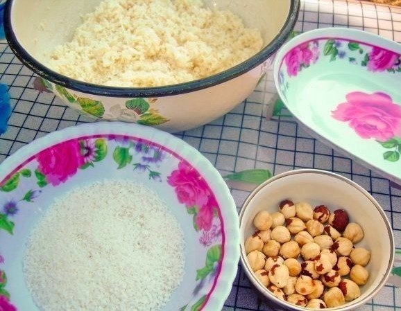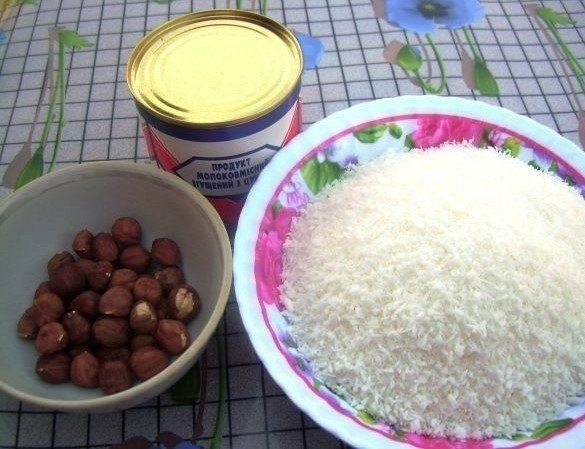 Подготовься к формованию конфет. Насыпь кокосовую стружку в отдельную посуду, подготовь ёмкость для готовых конфет и возьми непосредственно сладкую массу и орехи.