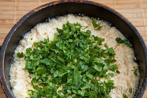 Ленивый хачапури жарим на разогретой сковородке, смазанной (именно смазанной, а не налитой) растительный маслом. Первый слой я посыпала резаной мелко петрушкой. Можно добавить кинзу, чтобы приблизить к грузинскому вкусу.
