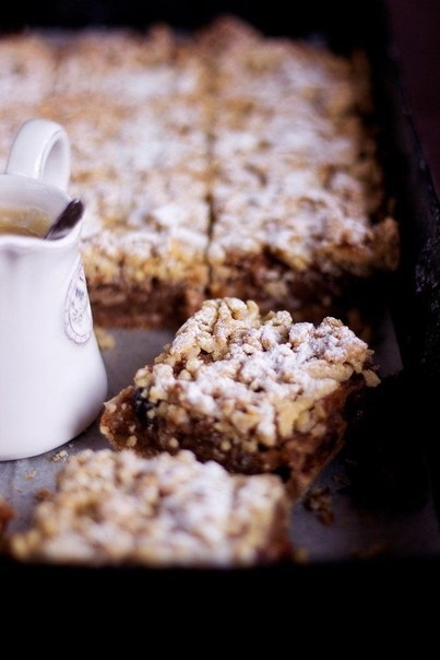 4. Затем равномерно выложите поверх коржа начинку. А затем потрите сверху (на крупной терке) вторую часть теста. Отправьте обратно в духовку и выпекайте еще минут 45 (также до золотистой корочки).