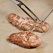 6 Куриное филе нарезать пластинами. Разложить их по кругу на большом блюде, оставив середину свободной. В середину положить красиво нарезанные овощи. Отдельно подать соус.