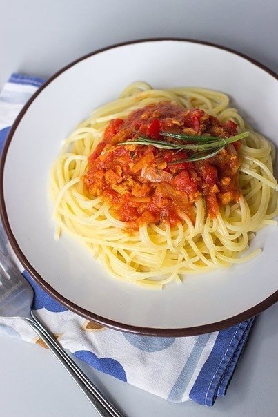 Овощи тушите 5-10 минут. Затем добавьте соевое мясо, томатное пюре и томат-пасту, зелень по вкусу. Влейте бульон и доведите до кипения. После того, как соус закипит, оставьте его тушиться еще минут 20.