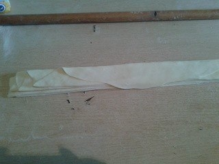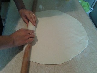 После того как раскатали до толщины к которой привыкли сами ( у меня любят очень тонкое тесто в пельменях) надо накрутить тесто на скалку и потихоньку раскручивая тесто на скалке сделать гармошку из теста.