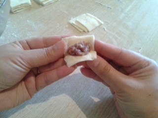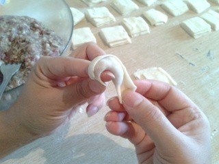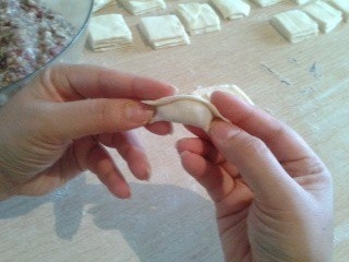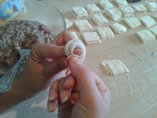 Берете кусочек теста, кладете фарш и складываете пополам и защипываете сверху и верх будущего пельмешка сгинаете, скручиваете. Мне удобнее делать это на палец.