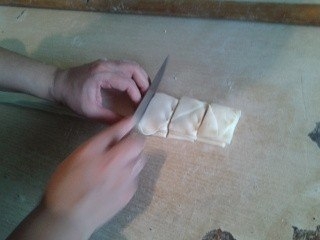 Ну так вот. Берем кусок теста. Обычное пельменное тесто из воды яйца и соли.