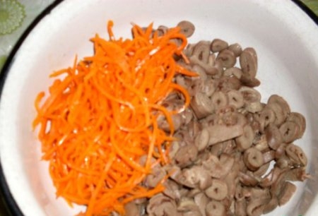 Куриные сердечки отвариваем в слегка подсоленной воде со специями на маленьком огне. Промываем в холодной проточной воде, остужаем и режем небольшими кружочками или соломкой.