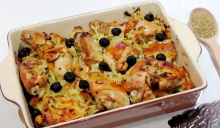Сверху выкладываем курицу, сняв с нее лук. Лук откладываем пока в сторону, он нам пригодится позже. Ставим форму в разогретую до 190 градусов духовку на 25 минут .