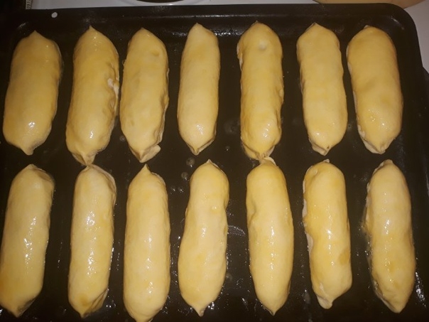 Три средних картошки отварила, лук пожарила на сл.масле, добавила в картошку мятую, соль, перец. Сосиски пополам! Тесто дрожевое сдобное. Смазать яйцом и в духовку на 15 мин. Из 7 сосисок получилось 14 пирожков!