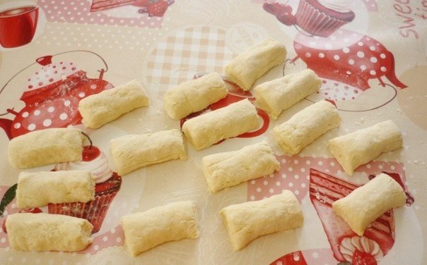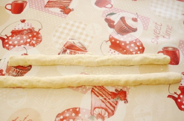 2. Посыпьте рабочую поверхность мукой и замесите тесто. Из полученной массы раскатайте тонкие колбаски. Нарежьте батончики любой удобной длины.