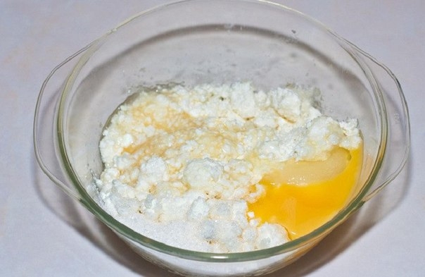 1. Хорошенько разотрите творог, чтобы убрать все комочки. Соедините в глубокой миске творог, яйцо, сметану, сахар, соду, разрыхлитель, соль, ваниль и муку. Тщательно перемешайте ингредиенты. Муки может потребоваться немного больше, всё зависит от консистенции творога.