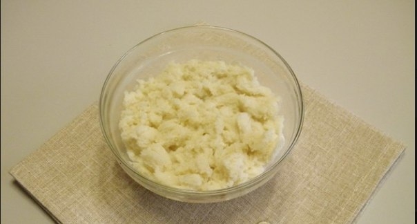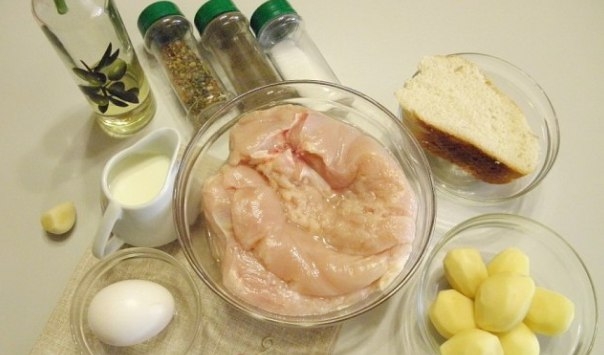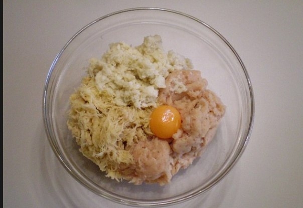 5. Картофель натрите на терке и добавьте в куриное мясо. Туда же введите желток, взбитый белок и хлеб с молоком.