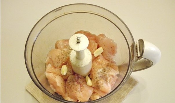 2. Измельчите куриное филе с солью, чесноком и прованскими травами. Их количество можно регулировать на свой вкус.