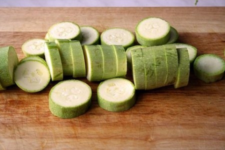 Шаг 1 Режем кабачки кружочками 1-1,5 см и обжариваем на растительном масле с каждой стороны.