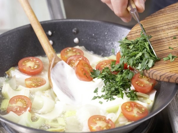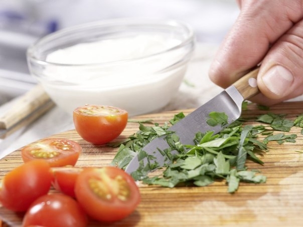 6. Между тем, вымойте и разрежьте надвое помидоры. Вымойте петрушку, стряхните с нее воду, оборвите листья и мелко нарежьте.