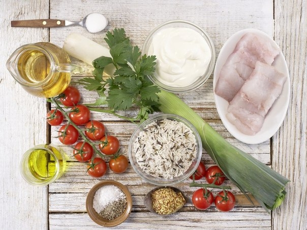 8. Подавайте рис с овощами и жареным хеком, полив все ингредиенты сметанным соусом.