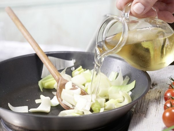 3. Нагрейте 1 столовую ложку оливкового масла в сковороде на среднем огне и обжаривайте, перемешивая, лук-порей в течение 2 минут. Залейте лук бульоном, доведите до кипения и готовьте на малом огне еще 5 минут.
