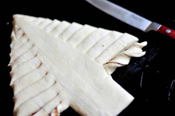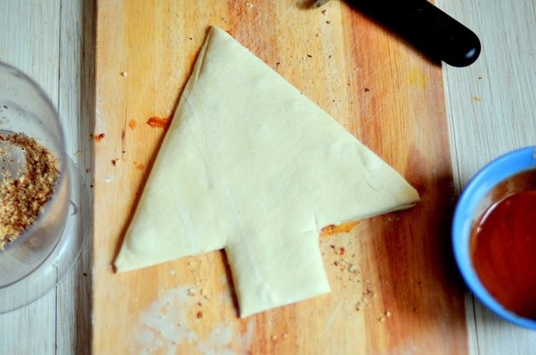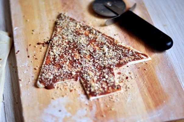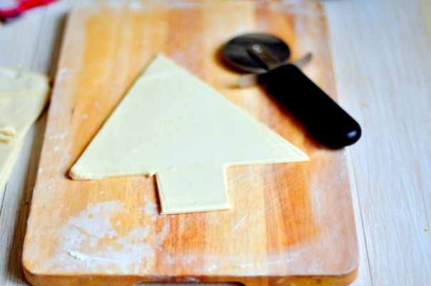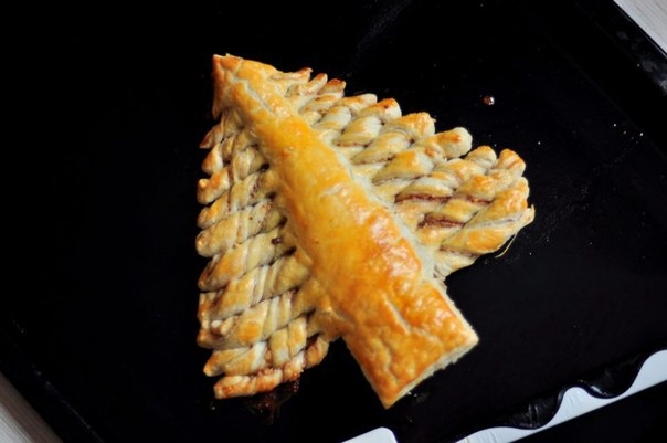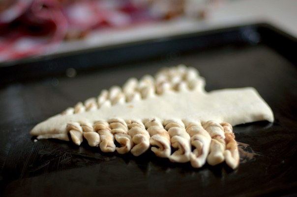 Я выложила елочку. предварительно, на смазанный противень, но советую изначально делать всю заготовку на пергаменте для выпечки и потом его переносить на противень. Таким образом выпечка не прилипнет и ее легко будет снимать с противня.