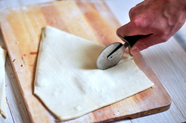 Рабочую поверхность припудриваем мукой. Слегка раскатываем слоеное тесто, чтобы не повредить слои.