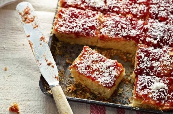 Нарезанные квадратики с вареньем выкладываем на основной корж и посыпаем сверху кокосовой стружкой.