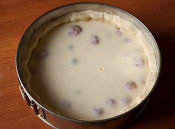 Выпекаем пирог в течение 40-50 минут в духовке при температуре 180 градусов до загустения заливки и образования на ней золотистой корочки. Пирог охлаждаем, разрезаем и подаем к чаю или кофе.