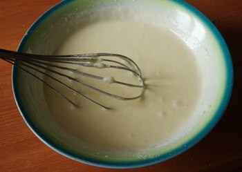 Готовим заливку. Для этого слегка взбиваем сметану с сахаром, яйцом и мукой.