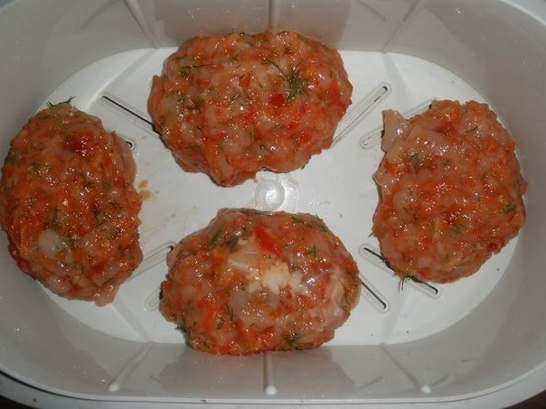 Лично от себя впечатления - безумно вкусно!!! Так диетично и легко! Не нужен никакой гарнир! Для себя я открыла такое вкусное сочетание перца, помидора и куриного мяса. На первый взгляд фарш был жидковат, все-таки помидоры дали сок, однако пароварка все скрепила! Котлетки ну очень сочные и нежные!
