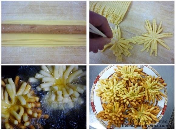 В середину полос положить скалку, и начать резать полосы 3-4 мм шириной, и так 7-8 групп полосок, далее следующая хризантема... середину хорошо продавить чтобы не распалать, расправить полосочки теста, придавая форму цветка, жарить во фритюре... до готовности...