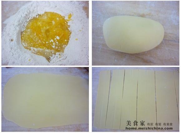замесить яичное тесто, раскатать лист толщиной 2 мм, разделить на полосы 3см, 4 см, 5 см, 6 см и 6.5 см шириной, сложить друг на друга от самого широкого до самого узкого, при этом в середине промазать водой или яйцом, чтобы не расклеились потом...