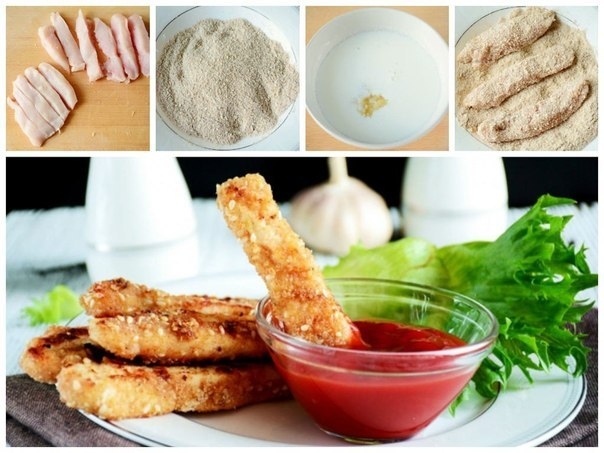 4. Погрузить каждый кусочек куриного филе в кефир, затем обвалять в панировочной смеси. Обжарить в сковороде на разогретом растительном масле до золотистой корочки.
