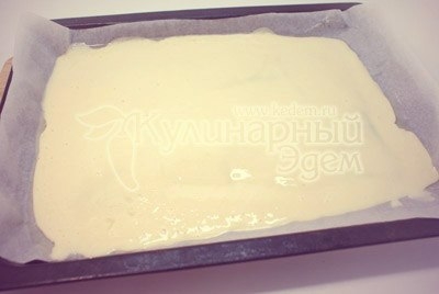 Вылить тесто на противень с пергаментом. - Тортик «Вкус любви». Фото приготовление торта с клубникой и маскарпоне.