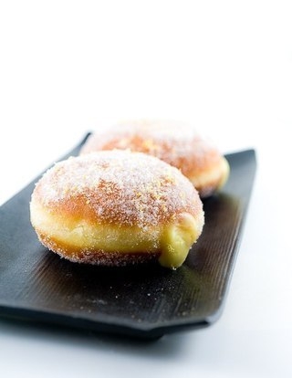 В чаше для миксера смешайте дрожжи, молоко, теплую воду и оставьте на пару минут. Добавьте муку, сахар, соль и яйца и взбейте на медленной скорости, чтобы тесто скрепилось. Добавьте размягченное масло, нарезанное кубиками, маленькими порциями. Взбейте до однородной массы. Оберните тесто и поставьте в холодильник на ночь. После раскатайте тесто толщиной около 1,5 см. Вырежьте около 12-14 больших кругов. Выложите их на присыпанный противень, закройте пищевой пленкой и оставьте на 2,5 - 3 часа подниматься. Духовку нагрейте до 175 градусов. Обжарьте пончики в кипящей масле около 2-3 минут с каждой стороны. Выложите пончики на блюдо, застеленное бумажным полотенцем. 1/2 стакана смешайте с цедрой и в этой массе обваляйте пончики. Остудите.